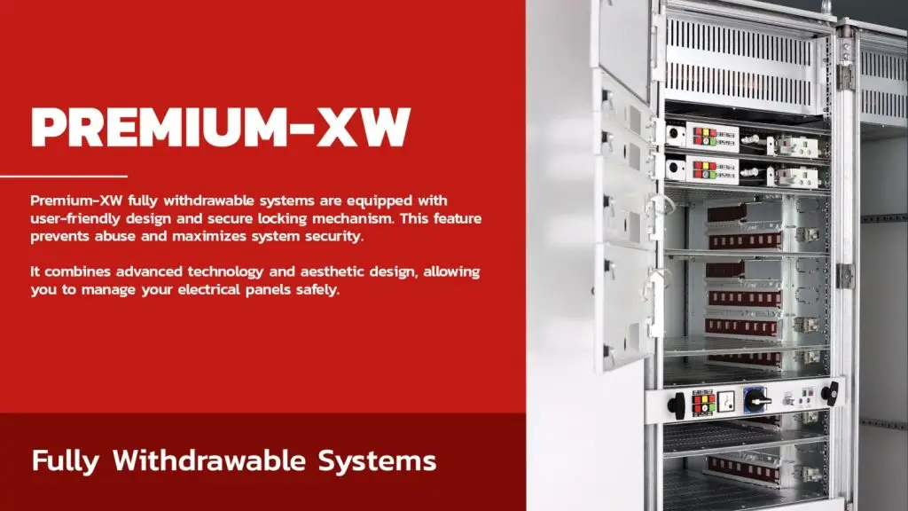 Premium-XW fully withdrawable systems are equipped with user-friendly design and secure locking mechanism. This feature prevents abuse and maximizes system security. It combines advanced technology and aesthetic design, allowing you to manage your electrical panels safely.
